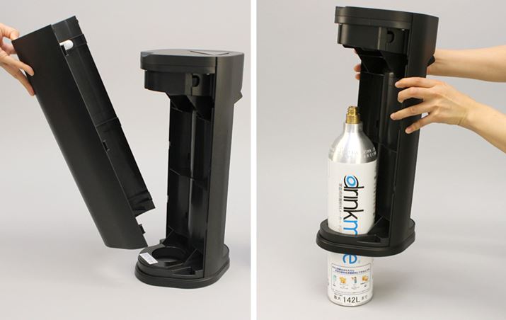 ドリンクメイトで炭酸飲料を作る手順は超シンプルです。本体背面のカバーを開けて専用のガスシリンダーを装着し、飲み物を入れたボトルを取り付けるだけで準備OK。あとは上部にある「ガス注入ボタン」を押せば、ボトルの中に炭酸が注入されます。