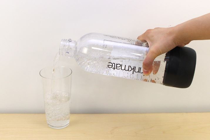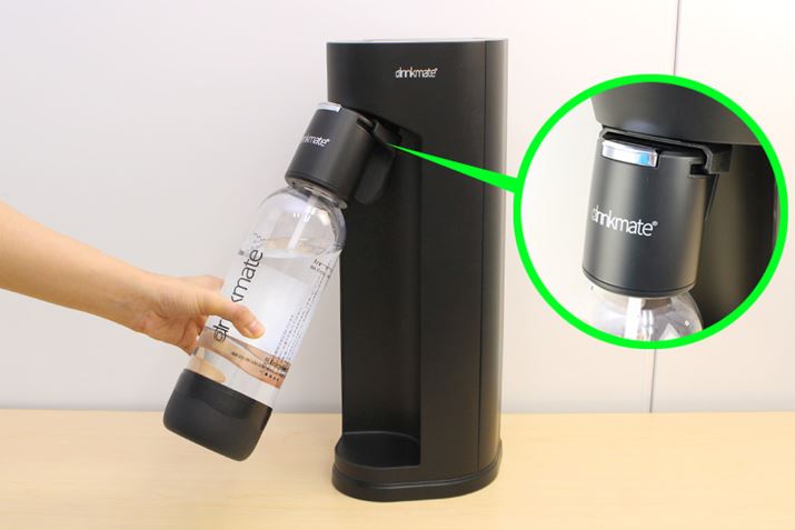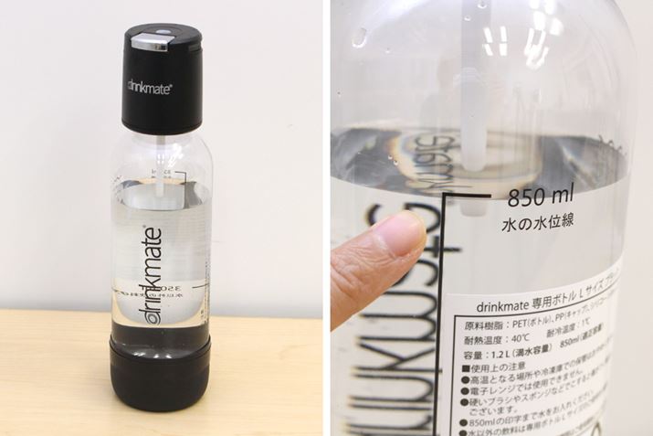 続いて、専用ボトルに飲料を注いで本体に取り付けます。最初のうちは、ボトルを取り付けるアダプター部が若干カタく感じられましたが、慣れるとスムーズ。水は最大「850ml」の線まで入れることができます