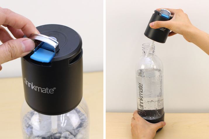 ボトルを外して軽く振り、水に炭酸をなじませたあと、インフューザー上部のタブを開けてガス抜きをしてできあがり