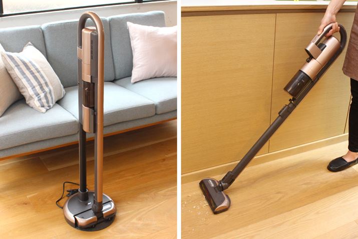 また、コンパクトなヘッドや細身のパイプに加え、ダストカップが手元側にある構造なので、クリーナー本体をほぼ水平に寝かせることが可能。おかげで、ソファの下などが掃除しやすくなっています。
