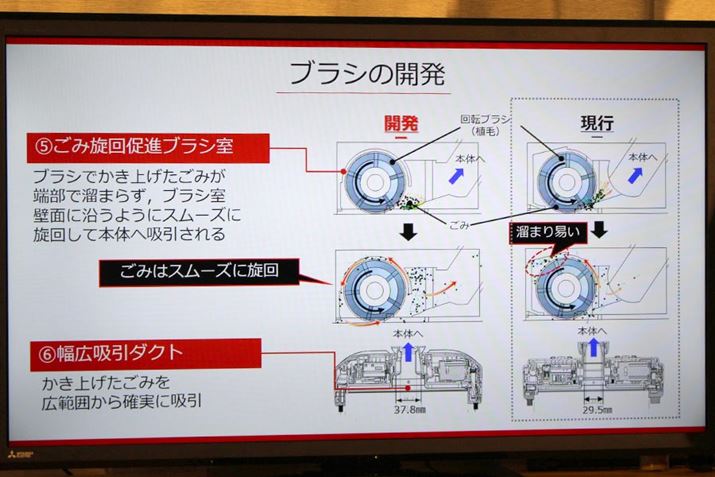 ブラシでかき上げたゴミがスムーズに本体へ吸引されるように改良した「ごみ旋回促進ブラシ室」など、ゴミ取り性能が改良されました