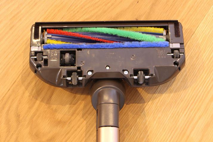また、モーターに加えてヘッドとブラシ部分も新しく開発されました。ヘッドは自走式で、ネオジウム磁石モーターを内蔵し、自走力とゴミのかき出し力を向上させています。ヘッド自体をコンパクトにしながら、その中で吸い込み口を広く取る設計とし、ブラシ面積を最大化。米粒などの大きなゴミでもしっかりとかき上げ、広範囲から吸引できるようになりました。