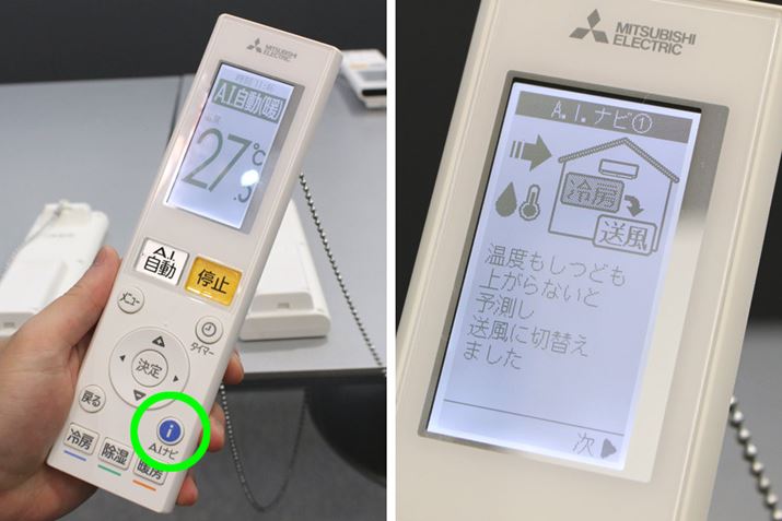 リモコンの右下にある「A.I.ナビ」ボタンを押すと、AIがどのように運転モードを自動コントロールしたか確認できます