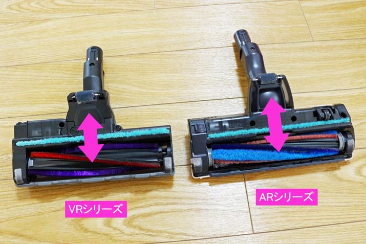 一般的に掃除機は軽量・小型化を重視すると、その分、吸引力が落ちる傾向にありますが、VRシリーズに採用された「コンパクトモーター」は高効率な性能なため、吸引力(フルパワーモード時)はARシリーズより約16%向上しているそう。また、ヘッドに関しても、幅は小さくなってもブラシの幅は従来のままなので、ヘッドを動かす回数は変わりません。