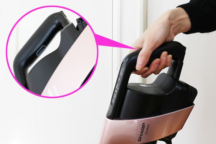 細かい改良点ですが、ダストカップの着脱がしやすくなりました。ARシリーズでは、ダストカップの下部を本体にあるフックに引っかけてから取り付けなければなりませんでしたが、VRシリーズは垂直にはめ込むというシンプルな方式に変更(下の動画参照)。ちょっとした違いですが、ワンアクションでスムーズに着脱できるのは、ゴミ捨てのわずらわしさを和らげてくれます。