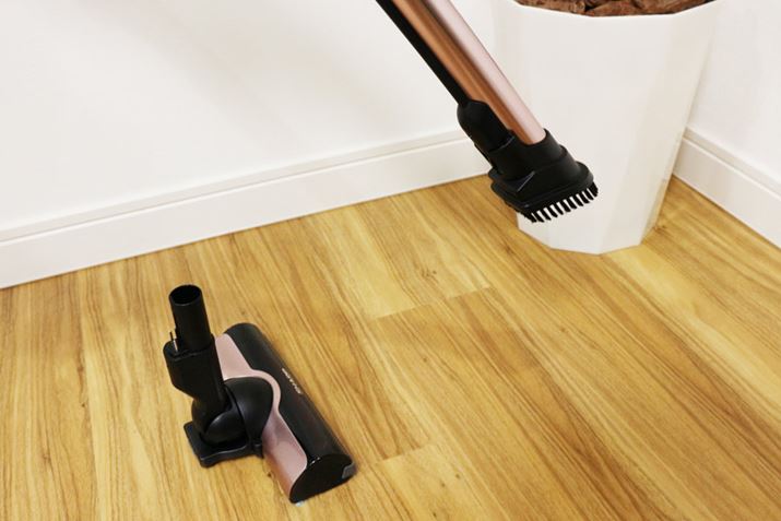 さらに、改良されたヘッドも使いやすさを高めることに貢献しています。パイプとジョイント部に当たる軸の部分とブラシのある部分との距離を短縮し、ヘッドの向きを変える際の回転面積を小さくすることで、コントロール性を向上。ヘッドの幅も1cm短くなっており、家具の脚などが多い入り組んだ場所にも入り込みやすくなりました。このように、すぐれた重心バランスを備えた軽量ボディに小回りの利くヘッドを採用したVRシリーズは、フローリングを掃除する際の筋負担はARシリーズより約33%少なくなったそうです。