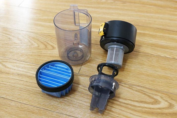 ダストカップは分解して、すべて水洗い可能。サイクロン部の中央にある芯の部分のパーツを引き抜くと、絡みついた髪の毛も取り除けます
