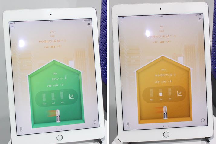 専用アプリのメインページで計測結果を確認できます。室内の空気がキレイなとき(左)と、有害物質が発見されたとき(右)。これまでの計測結果の履歴を見ることもできます