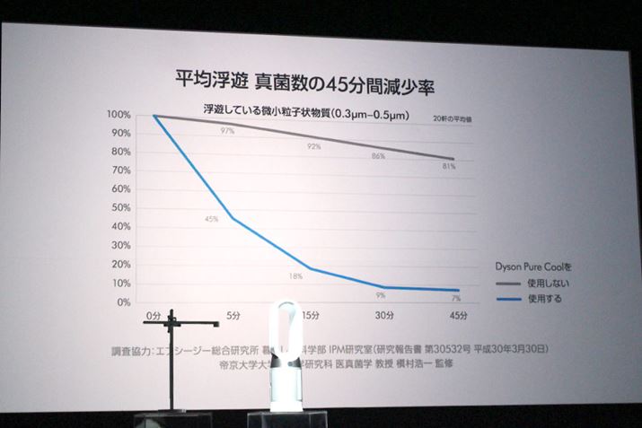 シリーズ違いのDyson Pure Coolを使用した場合の効果測定結果がこちら。Dyson Pure Cool を45分間運転させると、空気中に浮遊している微小粒子物質の割合が7%に減少したそう