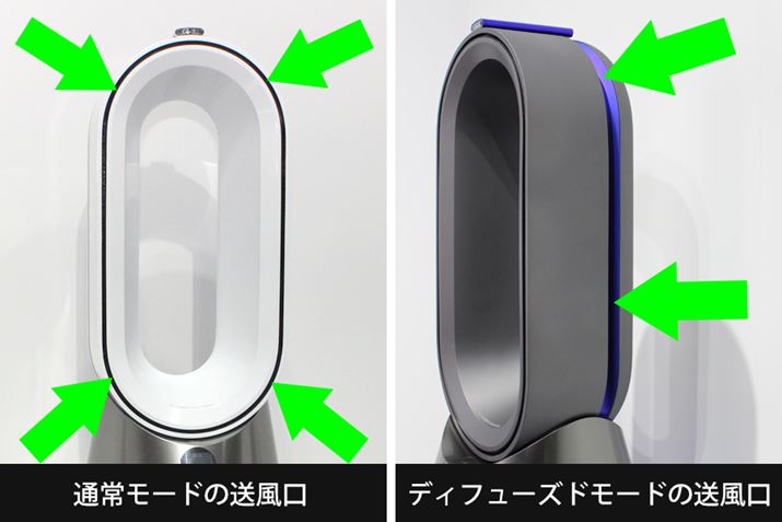 従来は本体フロントから風が排出されます(左)が、「ディフューズドモード」にすると、本体側面から排出されるように切り替わります(右)