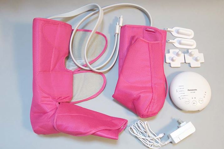 さて、両製品を取り出して、まず驚くのが大きさの違いです。「コードレス」と「ブーツ型」は、足に巻き付ける「アタッチメント」のサイズにはそこまで差がありません。ただし、「ブーツ型」はアタッチメントに空気を送るための太いホースが伸びています。さらに、ホースの先には直径14.5cmほどある操作器、そして操作器からはACアダプターが伸びています。収納場所も必要ですし、使用中もジャラジャラとたくさんのパーツがついている印象。