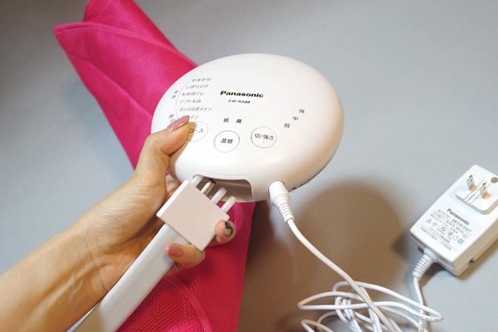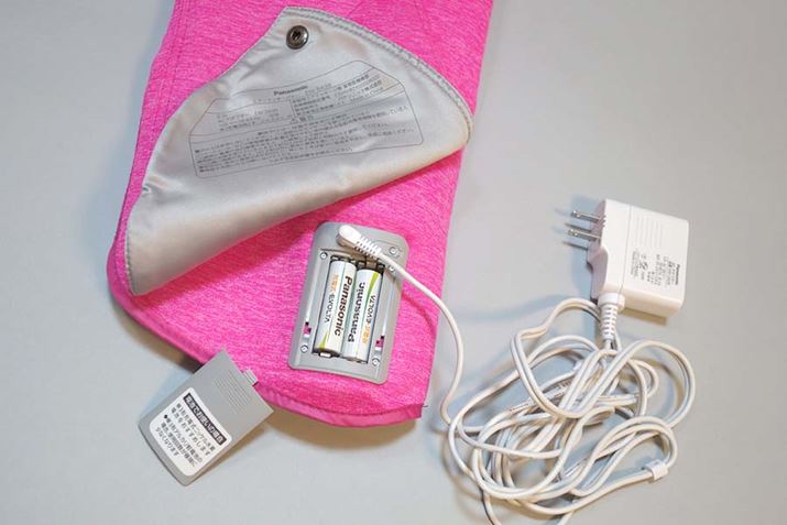 いっぽう、「コードレス」は、足に巻き付けるアタッチメントに操作ボタンとポンプが装備されているのでスッキリしています。AC電源コードも同梱されていますが、これはセットした電池が切れていた場合に予備電源として利用するもの。そのため、普段は使わなくても問題ありません。充電が切れた場合を想定しているのはかなりうれしいですね。贅沢を言えば、本体に充電池を入れた状態でACアダプターで充電できると便利なのですが、そのような機能はないそうです。