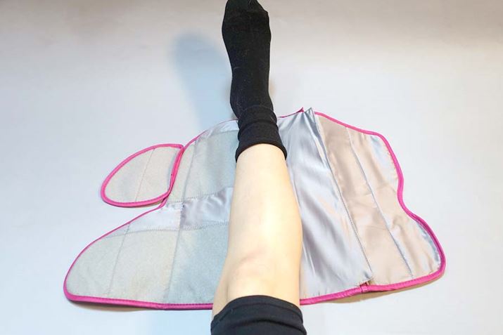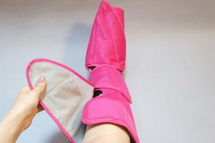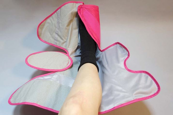 「ブーツ型」は足先から包み込むタイプなので、最初にアタッチメントに足を差し込んで、下からペタンペタンと面ファスナーを閉じ、最後にアタッチメントと操作器、操作器とACアダプターを接続します