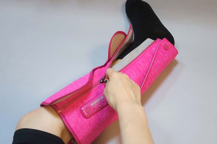 もうひとつ、個人的に気に入ったのが「コードレス」のアタッチメントの表面の質感です。従来のレッグリフレは、アタッチメント部分がナイロンぽい艶のある素材でした。いっぽう、「コードレス」は綿のような素材にチェンジ。従来の素材より汚れやすそうではあるものの、今までのような「いかにも家電!」という印象はありません。コードがないこともあいまって、一見すると「ちょっとゴツめのレッグウォーマー」にも見えます。面ファスナーの羽根部分が少々不格好ですが、このまま宅急便などの来客に応対しても違和感は少ないですし、オフィス勤務なら机の下で使ってもバレずに済みます。