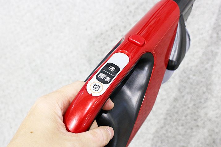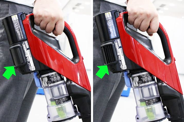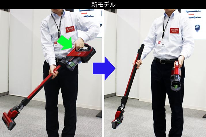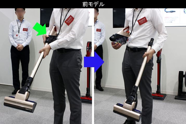 前モデルではこの着脱ボタンがハンドルから少し離れた位置にあったため、本体を抱えながら操作しなければなりませんでした。ちょっとした違いなのですが、使いやすさには大きな差が!