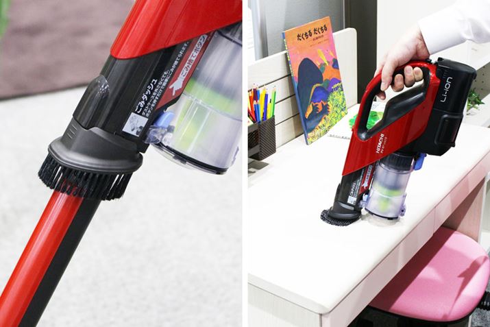 ラクに着脱できるようになったこともあってか、本体の先端に常に装着しておけるハンディブラシが新たに付属。パイプを取り外してハンディ掃除機状態にして、机の上のゴミなどを除去できます。また、ハンディブラシを付けたまま、ほかのツールを取り付けることも可能