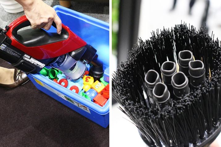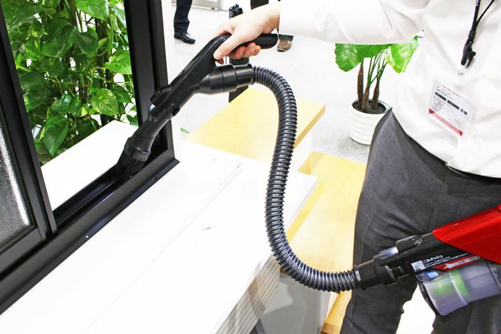 ブラシの中でも秀逸なのが、前モデルから継承された「ほうきブラシ」。ブラシの中に細いチューブ状の吸込口を設けることで、細かいゴミしか吸い込まないように工夫しています。この仕組みにより、たとえば下の動画のような文具が入った引き出しの掃除も、クリップなどは吸い込まず、ゴミだけ除去! 窓のサッシに溜まったゴミも、ほうきブラシでキレイにできます