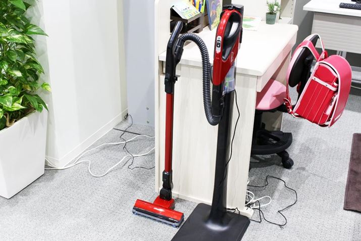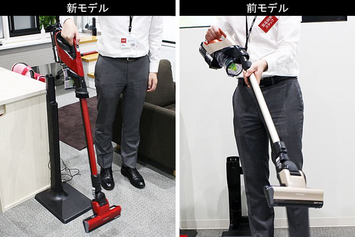サッと掃除できる工夫として、充電スタンドも一新。前モデルではコンパクトにまとめられ、かつ、アタッチメントも同じ場所に収納できるようになっていましたが、新モデルは素早く掃除できるようにシンプルな構造となりました。