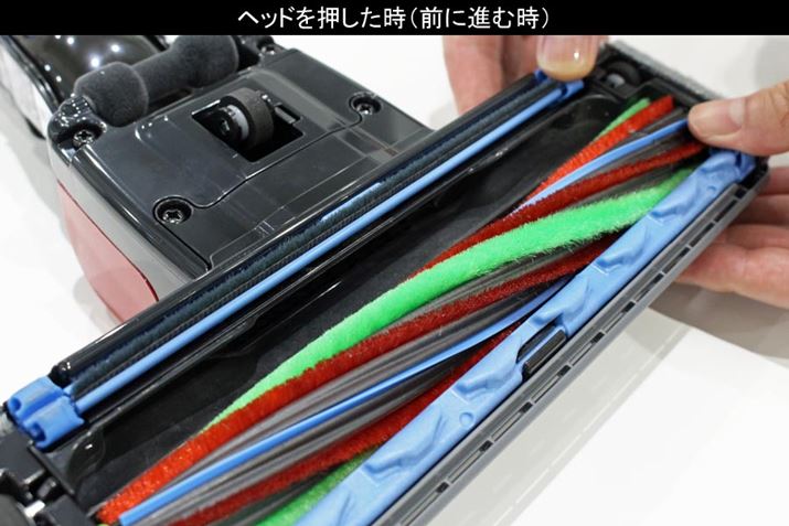 進行方向に向けて掃除する際は前側のフラップが開き、後ろ側のフラップが立つ状態とすることで床面との気密性を向上。また、大きめのゴミもヘッドで押してしまうことなく、きちんと吸い込むことができます