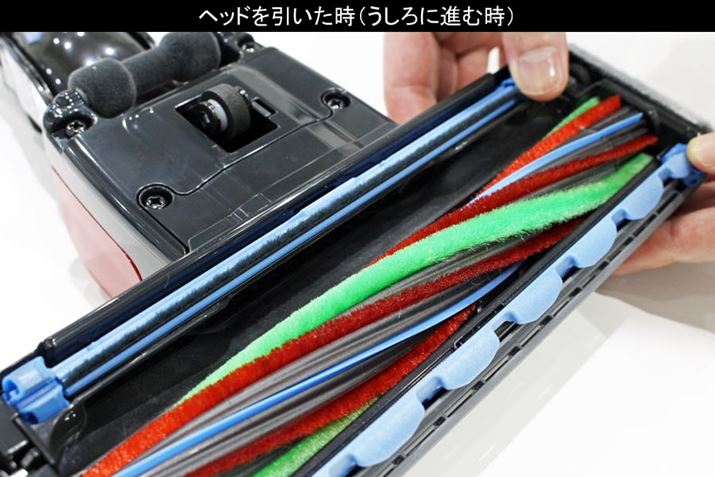 ヘッドを引いて掃除する時には前側のフラップが閉じ、うしろ側のフラップが開くので、内圧を高めたまま、後方のゴミをきちんと吸引することができます