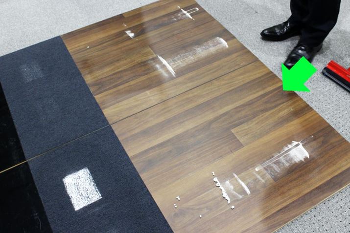 上の動画で行った検証を他メーカーのコードレススティック掃除機でしてみたところ、大きなゴミを前面から吸い込めない製品や、ヘッドを引いた際にはほとんど吸い込めていない製品などが続出! 矢印の先のキレイになっている部分はPV-BFH900で掃除機がけしたところです