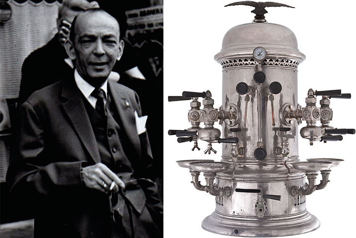 現在の主流である蒸気を使わない抽出方法を発見したAchille Gaggia氏。右の写真は、蒸気で圧力をかけていた頃のエスプレッソマシン。蒸気が直接コーヒーに触れるため、どうしても焦げた苦い味が出てしまっていたと言います