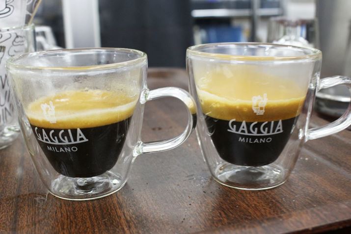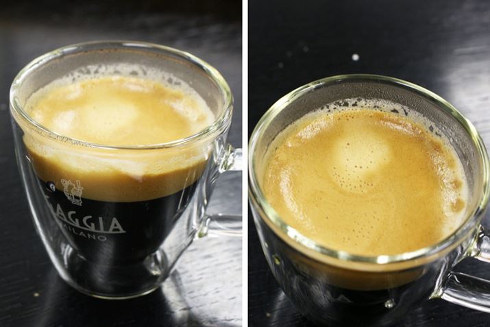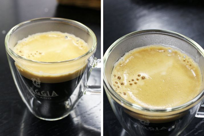 左が「パーフェクトクレマデバイス(圧力弁)」なし、右がありで淹れたエスプレッソ。クレマの厚みが倍近く違います!