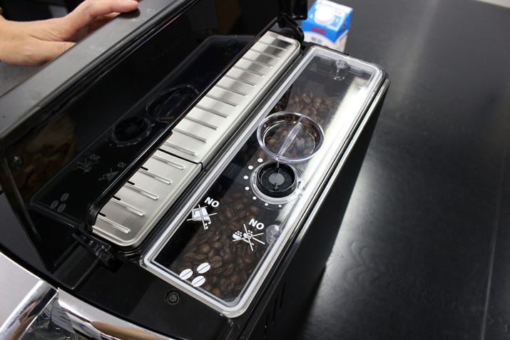 水タンクの反対側にはコーヒー豆をセットしておく容器(容量350g)があります。挽き方の粗さは8段階から選択可能。摩擦熱が少なく、均一に挽けるセラミック製のグラインダーが搭載されているので、静かな運転音でアロマを引き出したコーヒー粉が挽けるそう