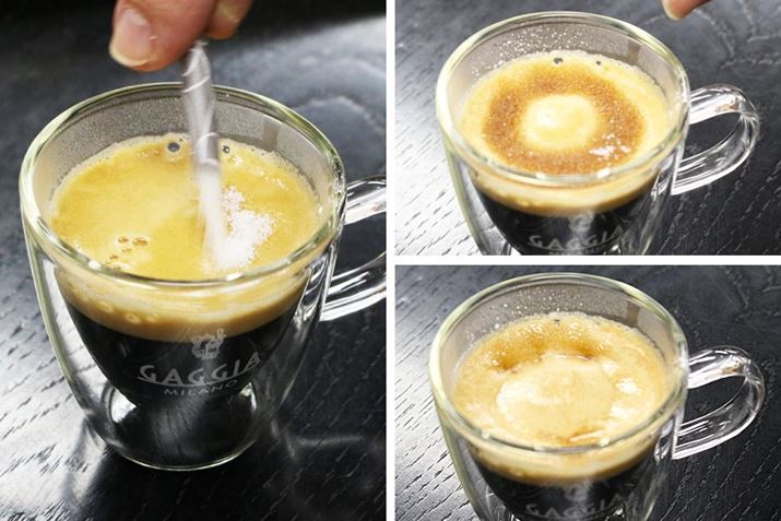 ついでに、いいクレマを見極めるワザも教えてもらいました。投入した砂糖がクレマの上で10秒以上残り、かつ、砂糖が溶けたあとも消えていないのがいいクレマなのだと言います。また、下の動画のようにマドラーやスプーンで混ぜたとしても消失しないのも、しっかりとしたクレマである証拠! なお、イタリアではエスプレッソに砂糖を入れることを前提として味を開発しているので、砂糖を入れたほうが理想的な味を楽しめるそうです