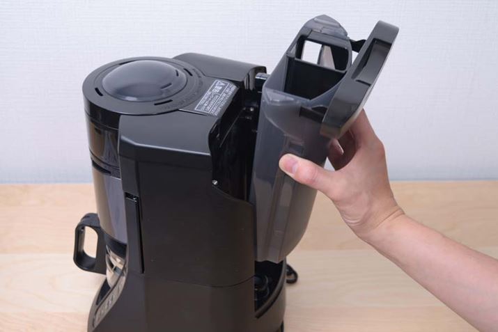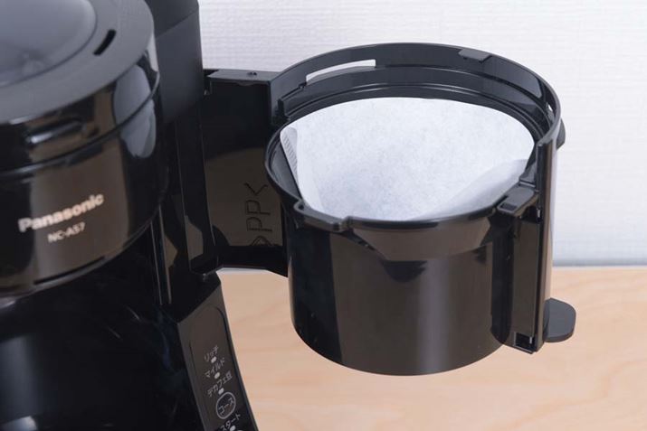 早速、「デカフェ豆」コースでコーヒーを淹れてみよう。まずは本体中央のバスケットを開け、ペーパーフィルターをセットする。バスケットがアクセスしやすく、お手入れもしやすいスイング式なのが好印象