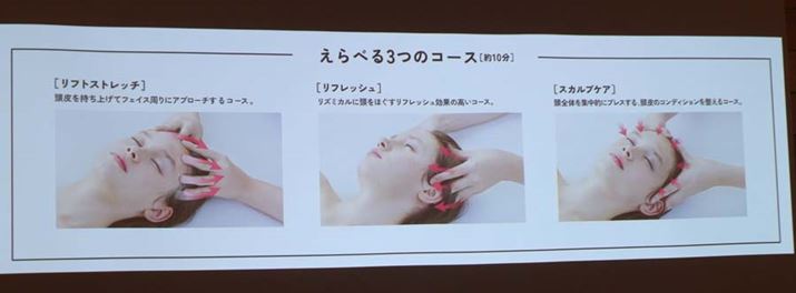 頭皮を持ち上げて顔まわりにアプローチする「リフトストレッチコース」。リズミカルに頭をほぐす「リフレッシュコース」、頭全体を集中的にプレスし、頭皮のコンディションを整える「スカルプケアコース」の3コースを搭載
