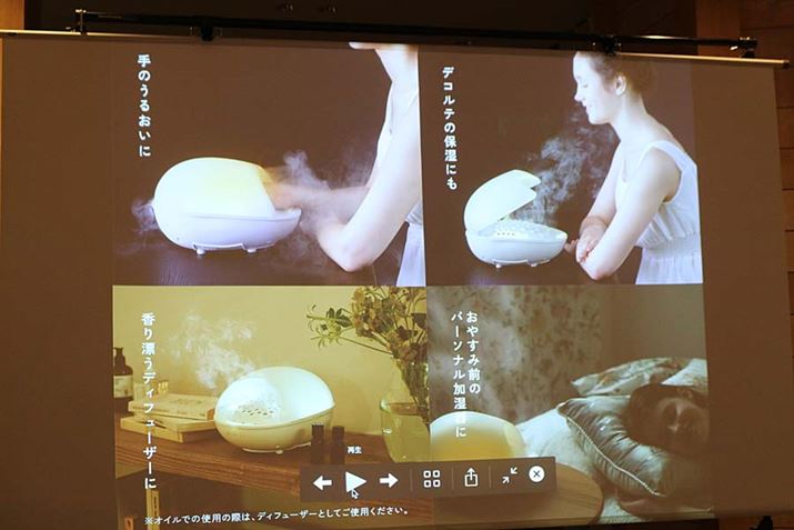 ハンドケア、デコルテケア(ともにオフタイマー約15分)、アロマディフューザー、パーソナル加湿器(ともにオフタイマー60分)の1台4役。ミストは「冷ミスト」に切り替えることも可能