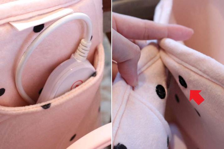 本体にはリモコンが収納できるポケット付き(左)。本体の内側のスナップボタンで両足のパーツを固定することで、すっきり自立させることができます(右)