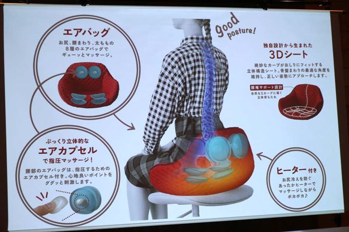 絶妙なカーブがヒップにフィット。10層のエアバッグや「エアカプセル」と呼ばれる突起によるマッサージ効果も得られます。実際に座ってみたところ、エアバッグがパワフルに腰の骨にアタック! かなり効きそうです
