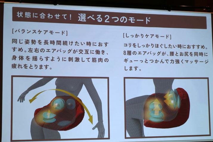 2種類のモードが用意され、同じ姿勢を長時間続けたい時は「バランスケアモード」、コリをしっかりほぐしたい時は「しっかりケアモード」が推奨されています