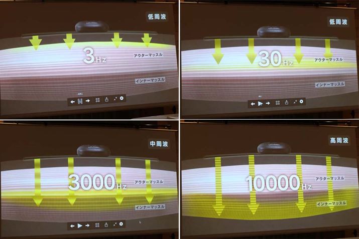 3 Hz(肩など脂肪が少ない部位に)、30 Hz(特に筋力をきたえたい部位に)、3,000 Hz(太ももやお腹などの脂肪が多い部位に)、10,000Hz(痛みを感じやすいデリケートな部位に)の4つの周波数を、部位によって使い分け。さらに、8段階で強弱調整が可能です