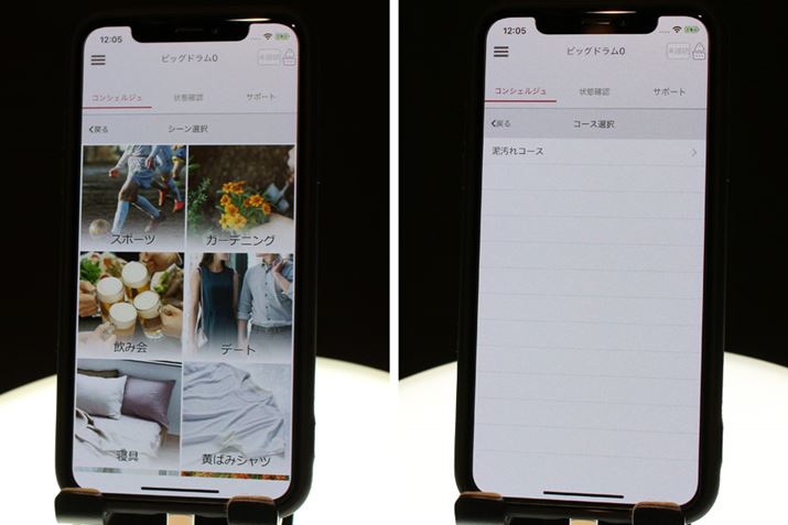 続いて、もうひとつの特徴であるスマートフォンとの連携機能について見ていきましょう。専用アプリをインストールしたスマートフォンからは洗濯機の運転状況を確認できるほか、遠隔操作やアプリからしか行えない洗濯コースを使ったりすることが可能に。また、アプリには、生活シーンや衣類の種類を選ぶことで最適な洗濯コースを紹介してくれる「コンシェルジュ機能」も用意されています。ハイクラスな洗濯機にはたくさんの洗濯コースが搭載されていますが、その機能はほとんど使われていないのが実状。もっと手軽にいろいろなコースを使ってもらえるようにという思いからコンシェルジュ機能を開発したといいます。