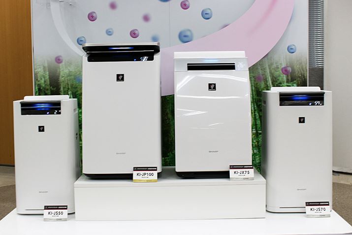 左からプラズマクラスター適用床面積〜13畳の「KI-JS50」(市場想定価格55,000円前後)、〜23畳の「KI-JP100」(市場想定価格13万円前後)、〜21畳の「KI-JX75」(市場想定価格83,000円前後)、〜16畳の「KI-JS70」(市場想定価格65,000円前後)。いずれも、2018年11月15日発売予定。なお、人感センサーと「プラズマクラスターNEXT」を搭載しているのは最上位機「KI-JP100」のみとなります