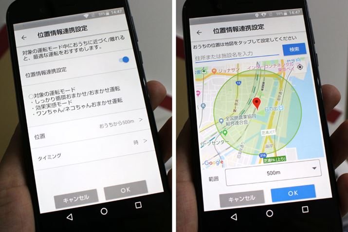 スマートフォンの位置情報とその他のセンサーを組み合わせて運転を自動コントロールできるのは、「おまかせ運転」と「効果実感モード」を選んでいる時のみとなります