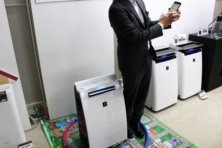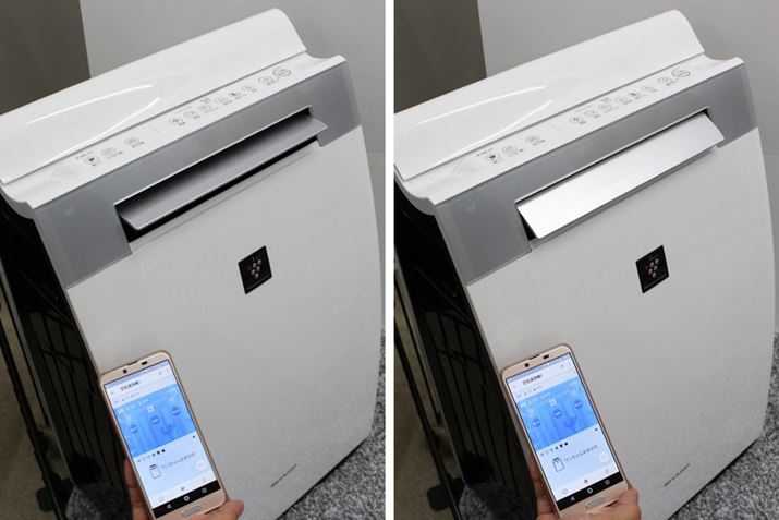 シャープの加湿空気清浄機はスマートフォンと連携することで、本体に搭載されたセンサー(温度・湿度・照度・ホコリ・ニオイ・人感)で収集したデータや運転状況、屋外の花粉やPM2.5などの空気状況をクラウド上にあるAI(人工知能)で分析し、最適な運転に自動的に切り替える機能を備えているのが大きな特徴。その機能がさらに進化し、新モデルではスマートフォンの位置情報をもとに毎日の生活パターンをAIが分析・学習し、運転に反映されるようになりました。たとえば、「おまかせ運転」にしておけば、朝食時には先回りして脱臭することで朝食のニオイを抑え、お出かけしている間にパワフルな運転で集中浄化。そして、帰宅前には加湿運転を始めて、うるおいのある空間でお出迎えといったように、ユーザーの行動により適した運転モードのコントロールを行ってくれます。