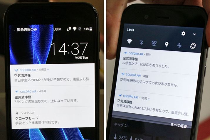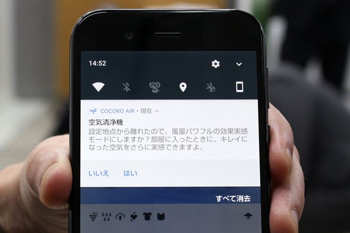 ちなみに、空気清浄機が不在と判断した際にパワフルな運転に切り替えるか否かは、おまかせ運転と効果実感モードともにスマートフォンに届いた通知で決定します。これは、自宅に人がいる場合にパワフルな運転に自動で切り替わることを防止するため。自宅に戻ってきた時にパワフルな運転から通常運転(効果実感モードでは控えめ運転)に切り替わるのは自動で行われます