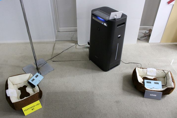 会場では、ペットの排泄物臭の主成分を付着させた布を消臭するデモンストレーションが行われていました。カタログなどに記載されている消臭効果は約6時間後の結果ですが、今回は約15分間パワフルショット運転した布と自然放置の布で比較。短時間なのでニオイは残っていたものの、プラズマクラスターイオンを当てていたほうがあきらかにニオイは弱くなっていました