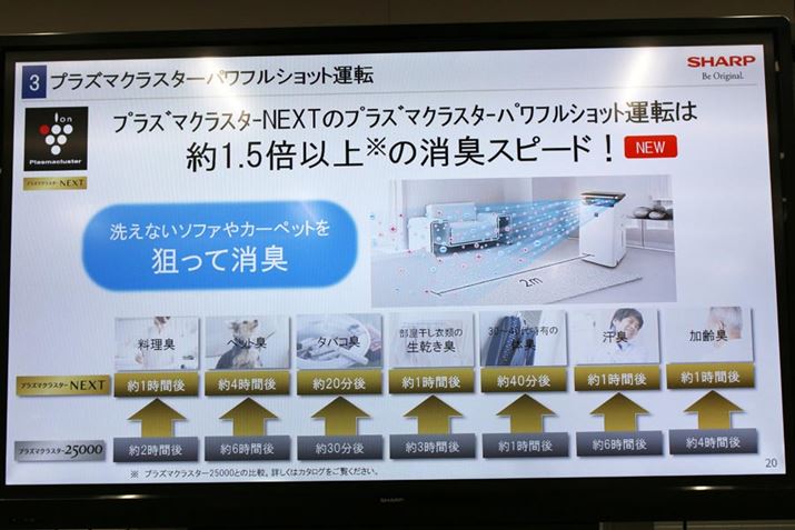 最上位機「KI-JP100」には、プラズマクラスターイオン濃度がその他モデルの2倍となる50,000個/p³放出される「プラズマクラスターNEXT」が搭載されているので、約1.5倍以上の消臭スピードが望めるとのこと