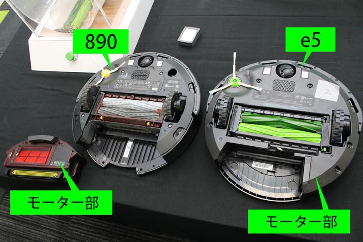 800シリーズ(左)ではダストボックス側に搭載されていたモーターが、e5(右)では本体側に搭載される設計に