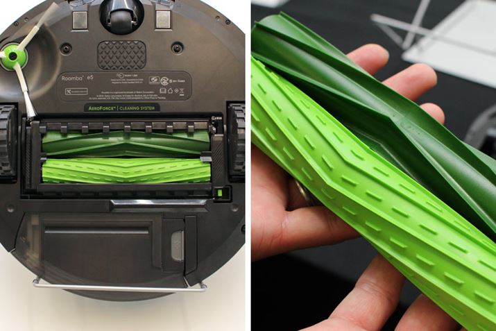 さらに、上位モデルに搭載されてきた特許技術「AeroForceクリーニングシステム」が採用されているのも特徴。これは特殊素材のローラーでゴミを浮き上がらせ、ハイパワーモーターによる気流でルンバ内部に真空状態を作り出して吸い取るシステムです。ローラー部分もe5専用に新開発されており、カーペット上の髪の毛やハウスダストなどの細かいゴミまで吸い取れるように工夫されています。そのイメージは、以下の動画をご覧ください。