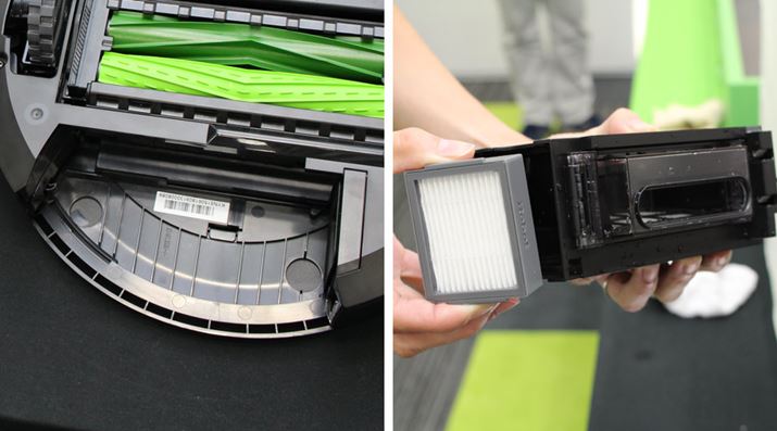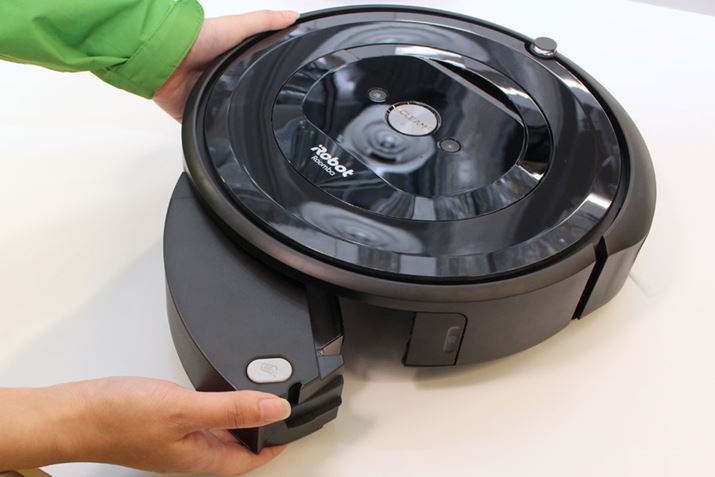 もうひとつは、ダストボックスが洗えるようになったことです。これは、特に日本のユーザーニーズにあわせて考案された仕様だそう。と言うのも、ルンバの従来機種は、ダストボックス部にモーターを内蔵していたため、水洗いすることが不可能でした。e5は、モーターを本体側に搭載する新設計になっており、ダストボックスを水洗いして清潔に保てるようになったのです。