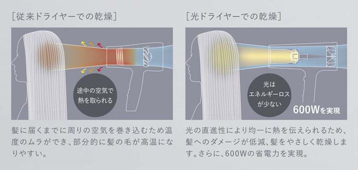 一般的なドライヤーの場合、温風が髪に届くまでにまわりの空気を巻き込むことで温度のムラができやすく、部分に髪の毛が高温になりやすいそう。いっぽう、「光ドライヤー」は光の直進性を生かし、均一に熱を与えられることで、髪へのダメージが抑えられます