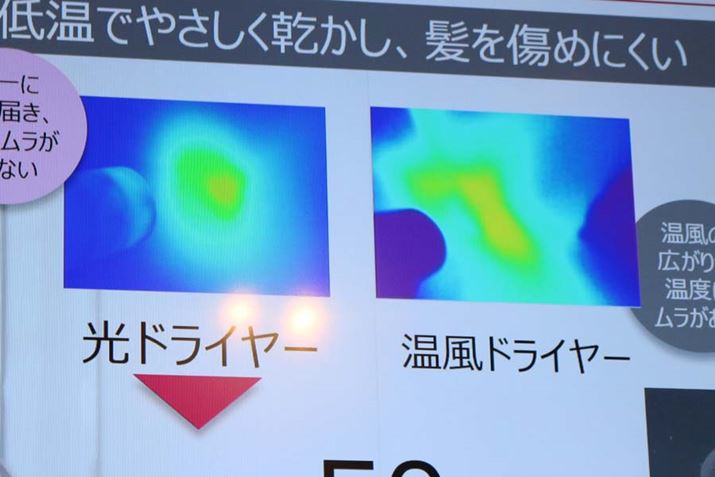 ドライヤーを当てた髪をサーモカメラで撮影したもの。「光ドライヤー」では均一に光が届いているため、髪の温度にほとんどムラがない(左)のに対し、一般的なドライヤーは温風の広がり方や温度にムラが見られます(右)