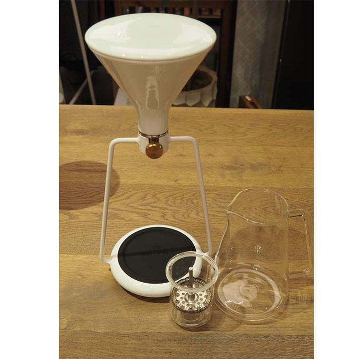 セラミック製のドリッパーと、ドリッパー用のフタにドリッパーをセットできるBluetoothスケーラー機能を搭載したスタンド(写真奥左)。強化耐熱性ガラスピッチャー(写真右)と、コールドドリップ用のグラス(写真手前)がGINAの基本セットとなります