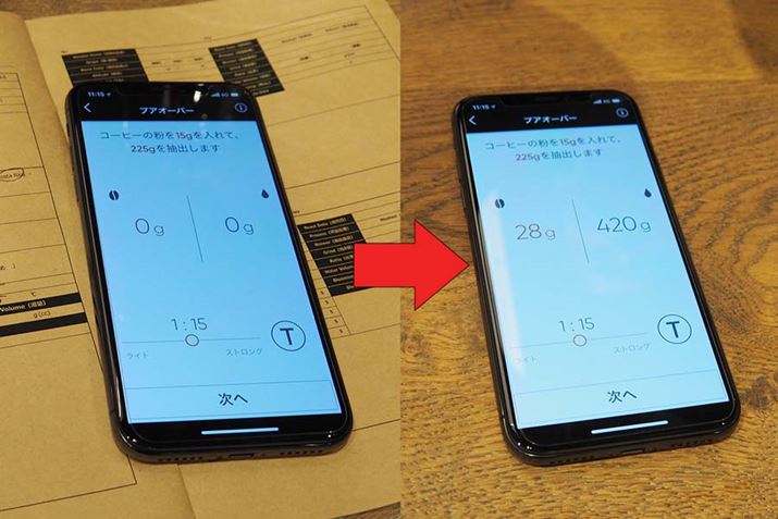 ドリッパーに豆を入れると、リアルタイムに必要な湯量が計算されて表示されます。「1:15」とある下のスライドバーを移動させることで豆と湯量の比率を変更することも可能。また「T」のアイコンは紙フィルターなどの重さを除外するための風袋引き機能です